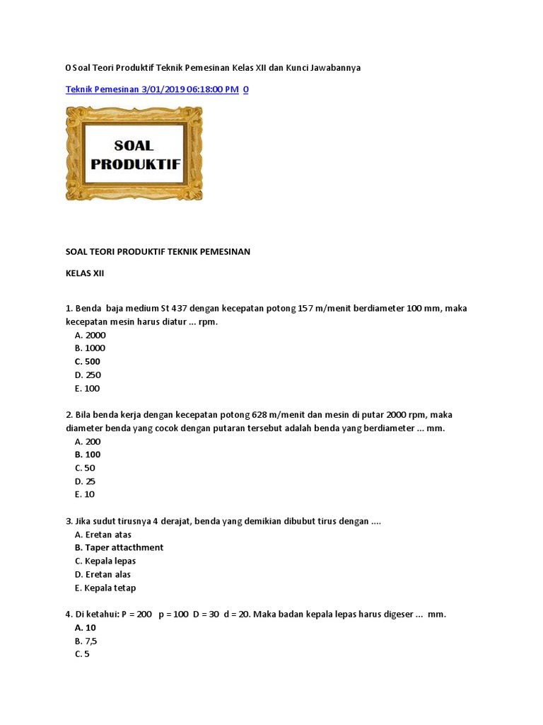 40 latihan soal unbk teori kejuruan teknik pemesinan beserta kunci jawaban dan pembahasanya paket 2. 30 soal uas melakukan pekerjaan dengan mesin bubut beserta kunci jawabanya teknik pemesinan Soal dan jawaban bubut komplek kelas 12 teknik pemesinan. Alat komunikasi utama dalam proses pembuatan benda kerja disebut. Rpp gerinda kelas xi tp 2016 2017.
